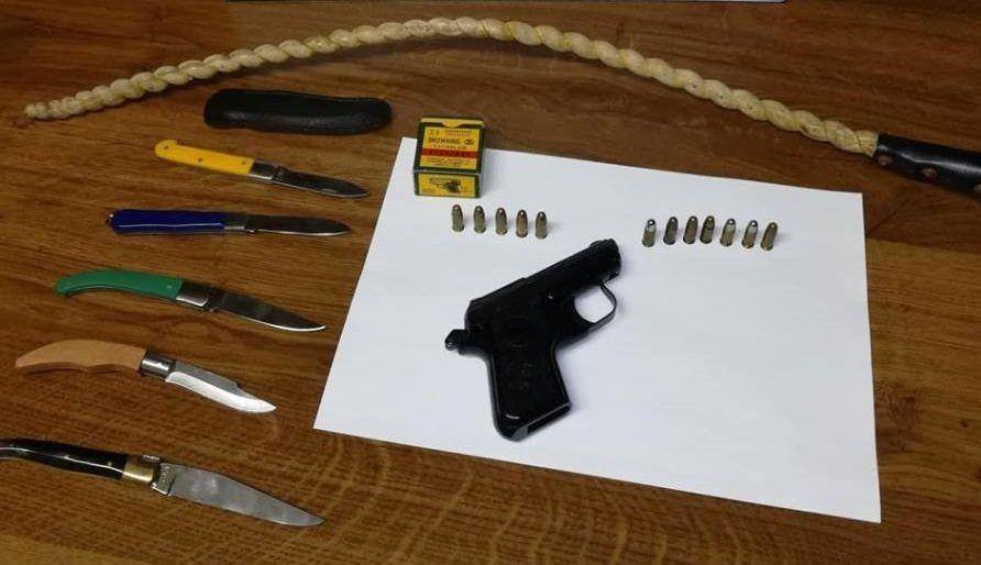 No decorrer de busca domiciliária efetuada à residência do suspeito foram apreendidas uma arma de fogo, 12 munições de calibre 6,35 mm, 5 navalhas, e um chicote, acrescenta a mesma fonte.