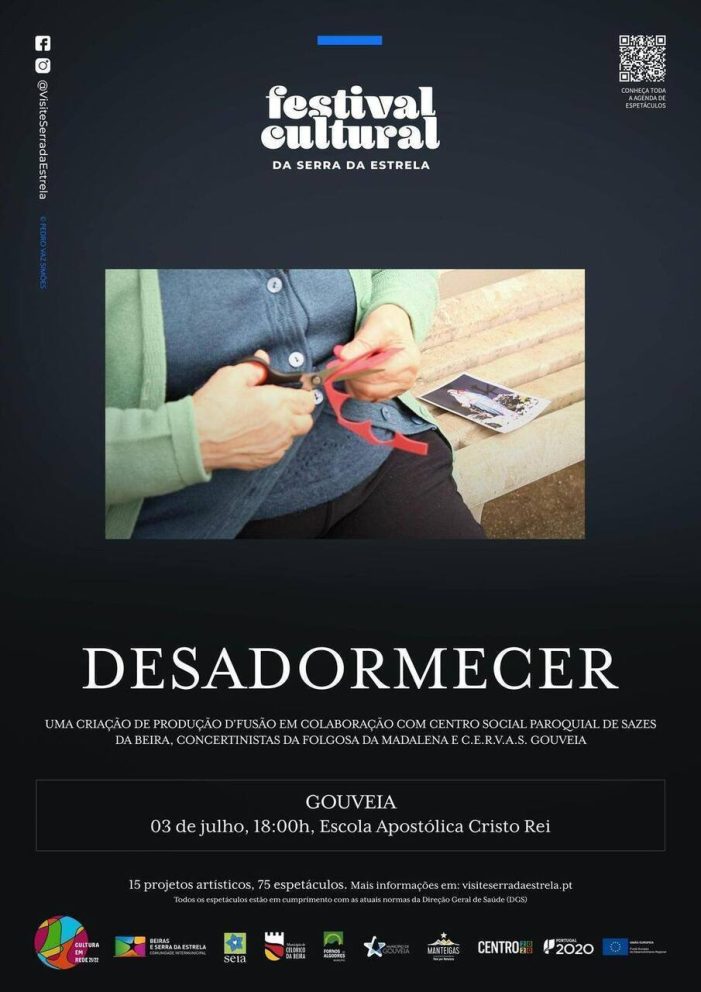 O espetáculo “Desadormecer”, que integra o Festival Cultural da Serra da Estrela promovido pela Comunidade Intermunicipal das Beiras e Serra da Estrela (CIMBSE), estreia este fim de semana, 2 e 3 de julho, com duas apresentações: no sábado em Fornos de Algodres (Largo da Igreja da Misericórdia) pelas 18h00 e no domingo em Gouveia (Escola Apostólica Cristo Rei).