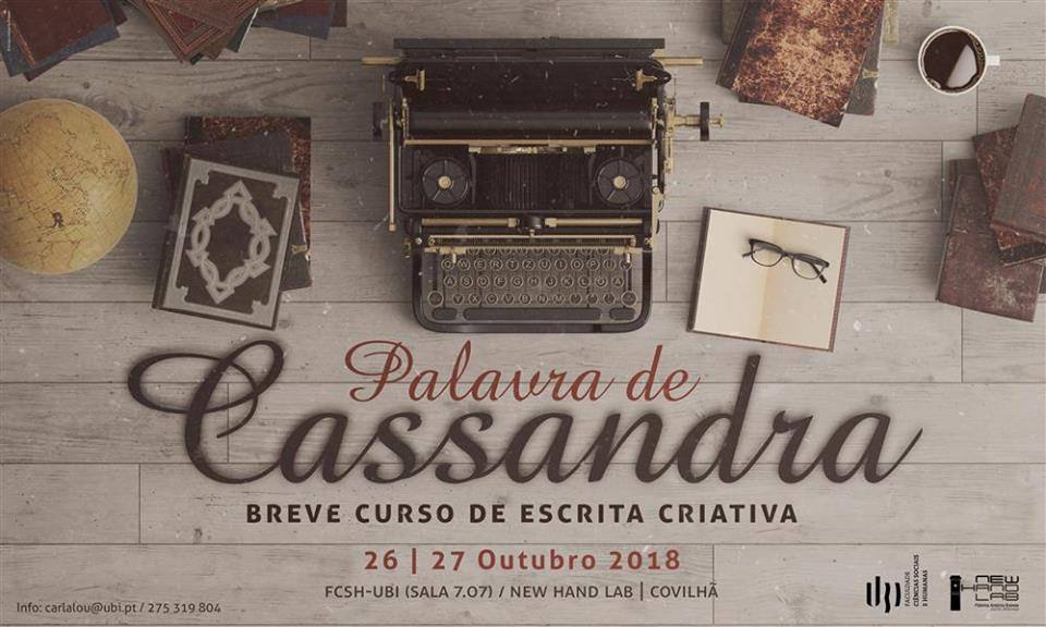 A atividade denominada “Palavra de Cassandra – Breve curso de escrita criativa” vai decorrer no dia 26 de outubro, na sala 7.07 da FCSH, entre as entre as 14 horas e as 18 horas. No dia seguinte, a sessão realizar-se-á nas instalações do New Hand Lab, das 10 horasàs 17 horas.