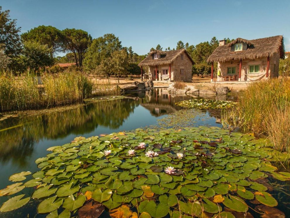 Depois, as cinco casas que ficam à entrada do espaço – a que se juntam outras duas, maiores, uma em formato duplo, que permite receber famílias mais numerosas – e que têm uma cobertura vegetal por cima dos telhados, são uma espécie de “imagem de marca” do aldeamento turístico.